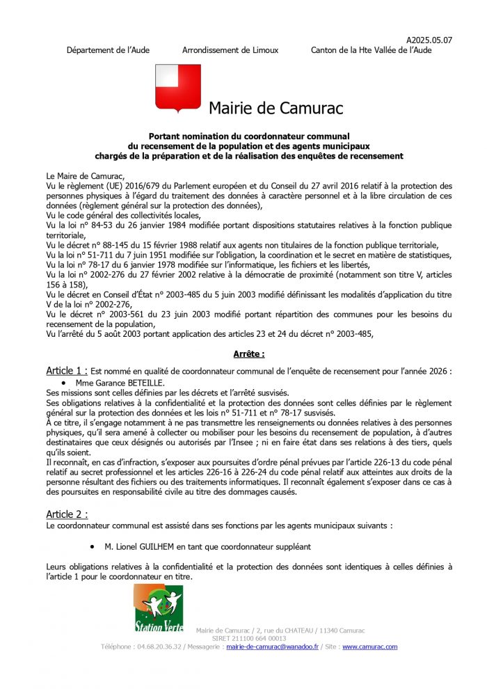 A250507 Nomination coordonnateur communal aux opérations de recensement de la population