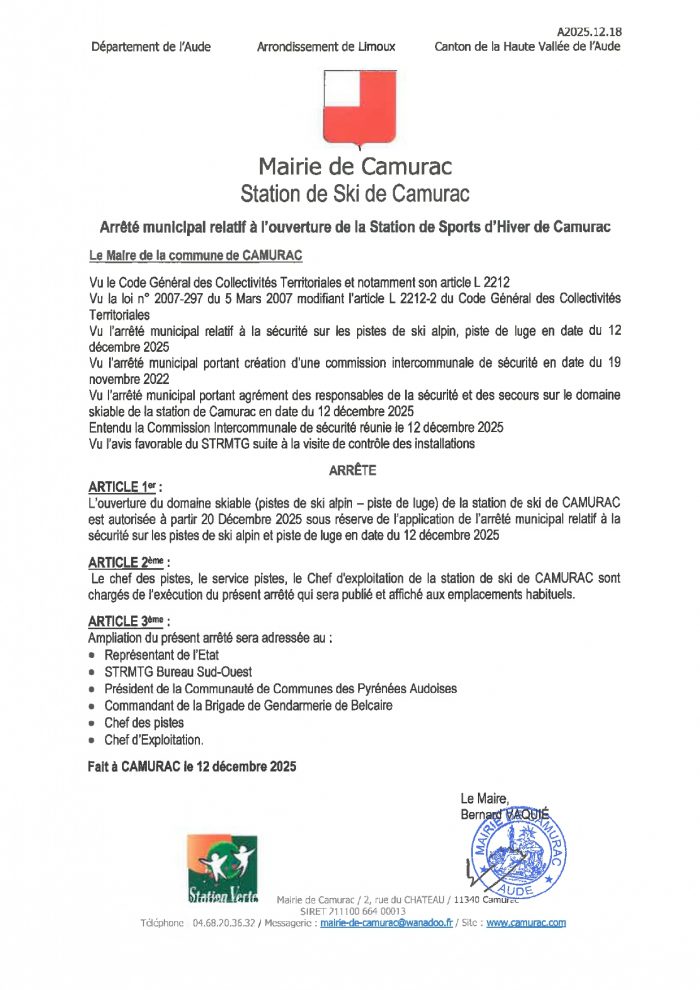 A251218 Arrêté relatif à l’ouverture de la station de ski