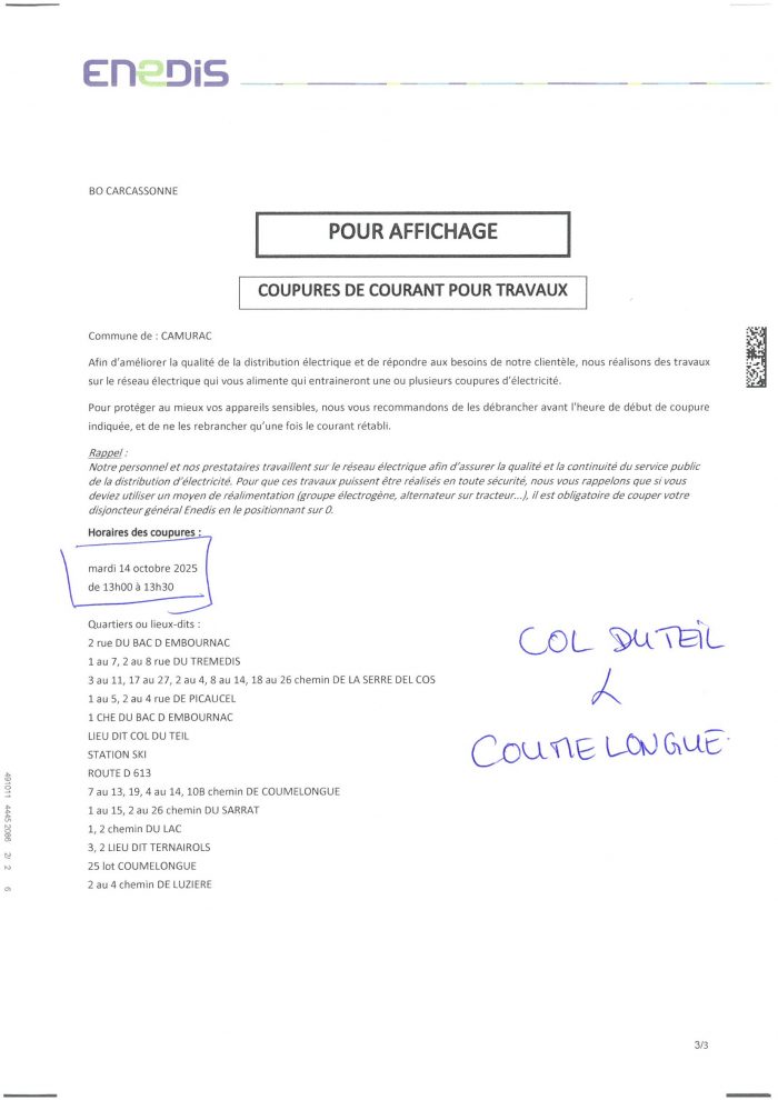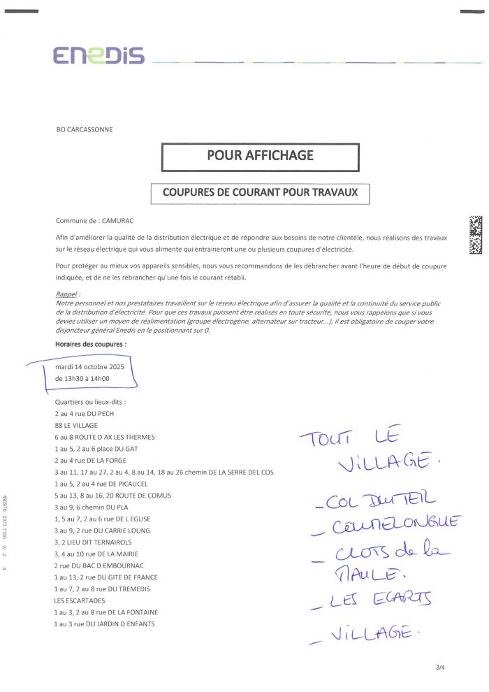 Coupures électricité le 14 oct 2025 13h00 puis 13h30
