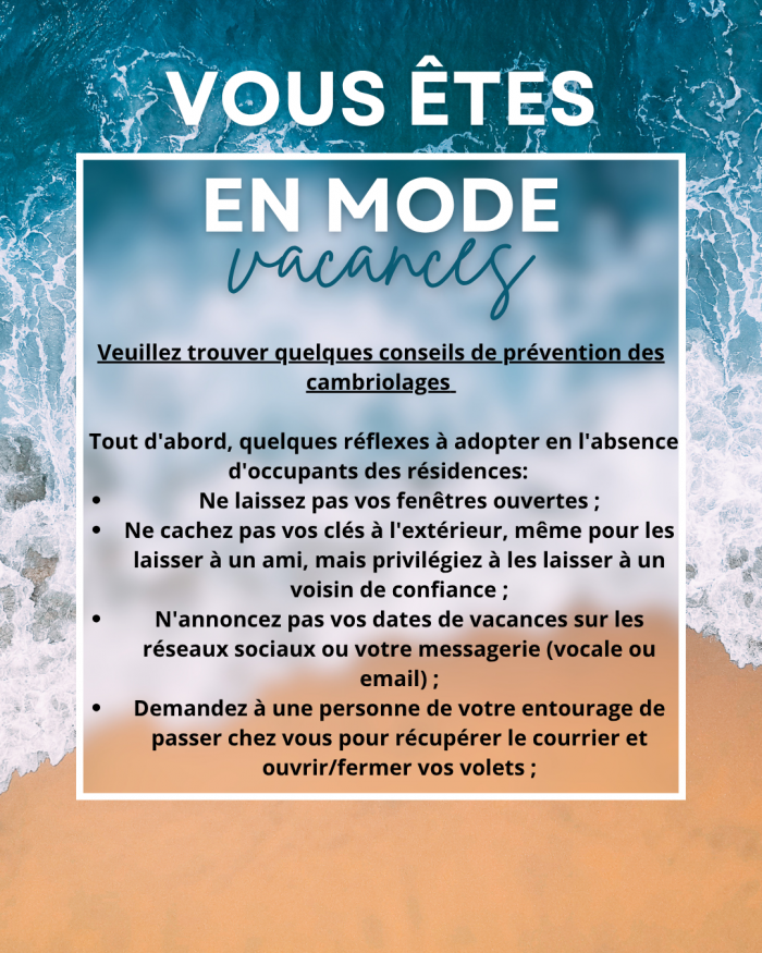 Avant leur départ les résidents sont invités à se rendre à la brigade de gendarmerie de leur domicile afin de communiquer les dates d’absence et leur lieu de villégiature ( pour pouvoir être joint si besoin).